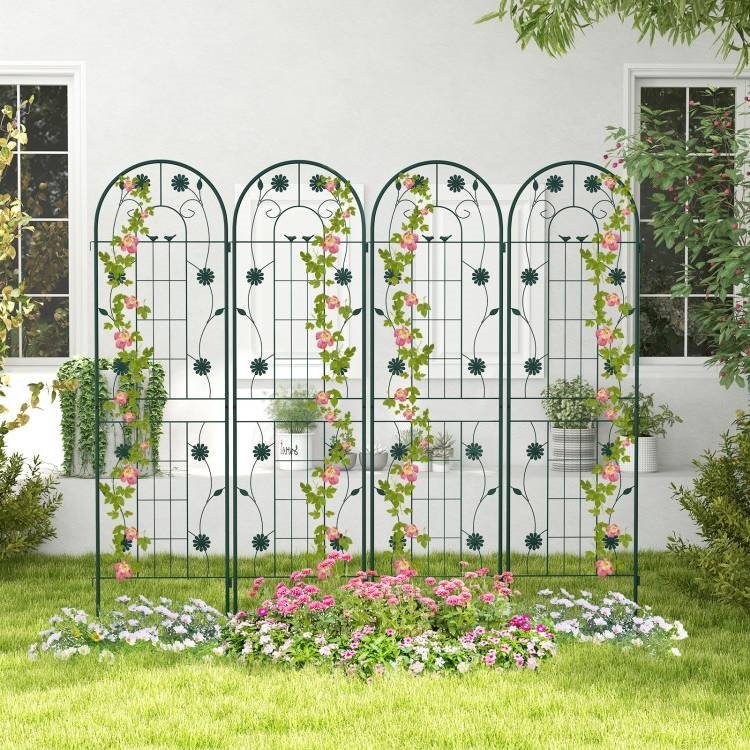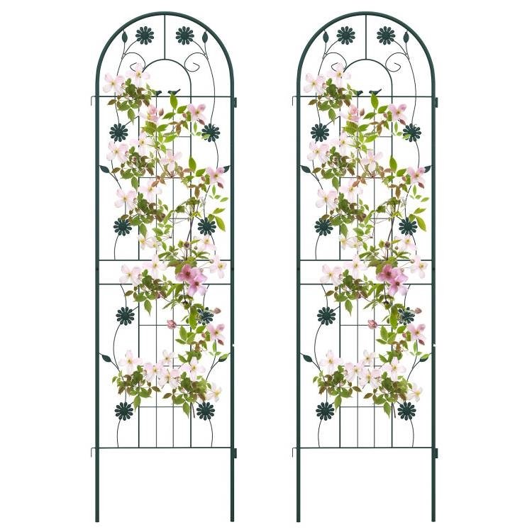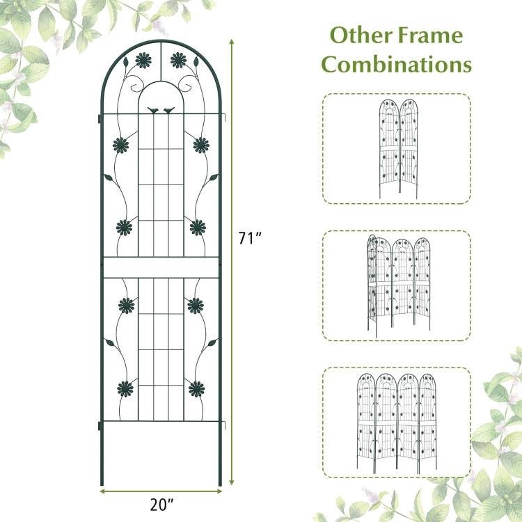 This Set of 2- Outdoor 6-ft Galvanized Steel Garden Trellis in Green Metal Finish is constructed of galvanized steel, ensuring unrivaled sturdiness and rust resistance to hold heavy plant for longer time. The trellis features 10.5", 11" long legs, allowing for effortless insertion into the ground, providing a stable foundation. With impressive heights of 71", the metal trellis offers an expansive area for your climbing plants and vines to reach new heights. By providing an abundance of vertical space, your plants can thrive as they eagerly stretch towards the sun's nourishing rays. Apart from being used as a plant support for climbing plants. The 2 pack trellis set can be combined with a garden fence, ensuring the protection and privacy of your cherished plants. Plus, you can connect 2 or more trellis in an A-shape frame for growing cucumbers or other climbing vegetables. Designed with enchanting birds, flowers and leaves, the tall garden fence will effortlessly add a touch of timeless elegance and retro charm to your garden, lawn, or yard. Moreover, you have the freedom to arrange more trellises to different layouts according to your unique requirements. Coming with complete components and a detailed instruction manual, the assembly process of the wire lattice grid panel is a breeze. Besides, the 2 pack fence trellises are designed with an effortlessly interlocked connector, allowing for quick setup.